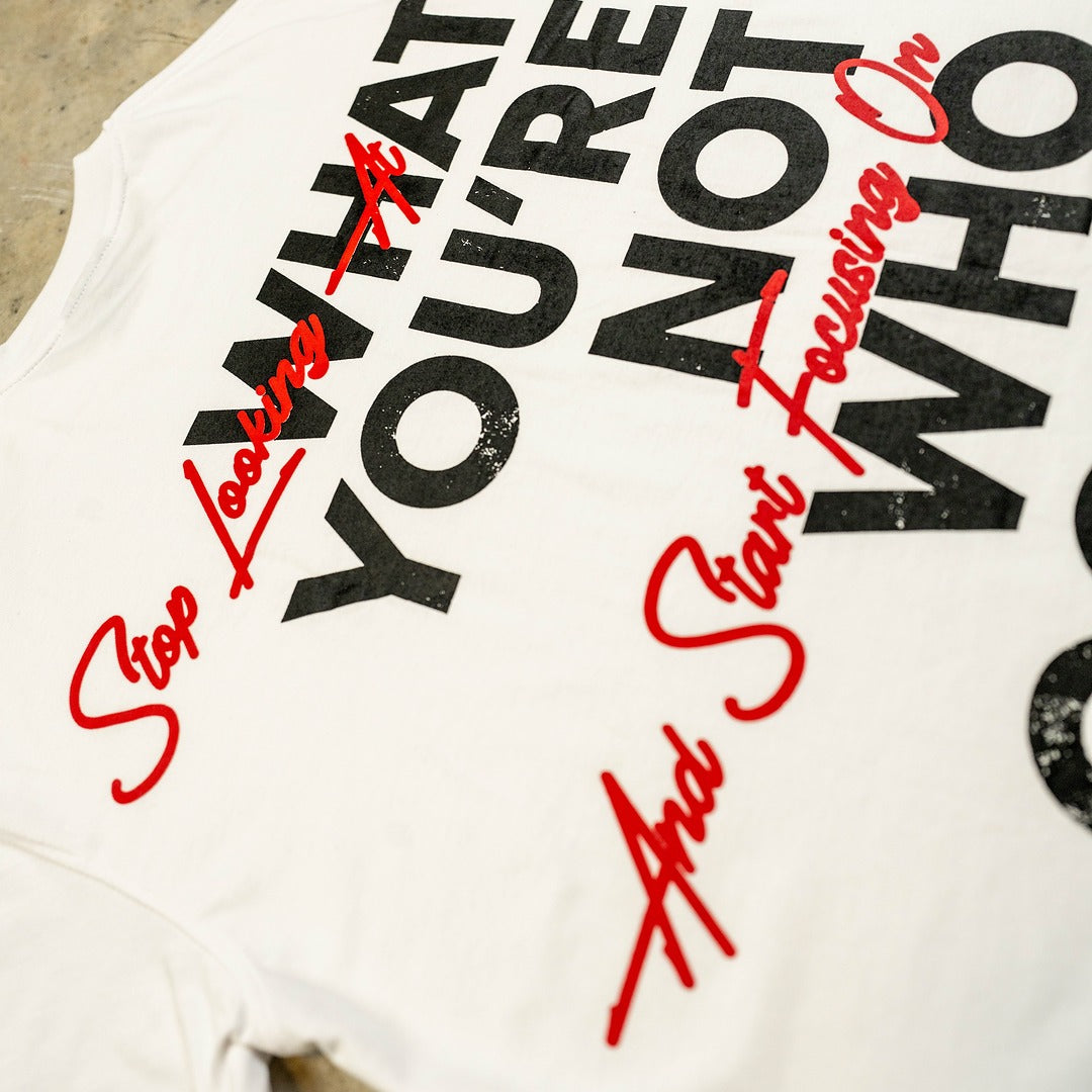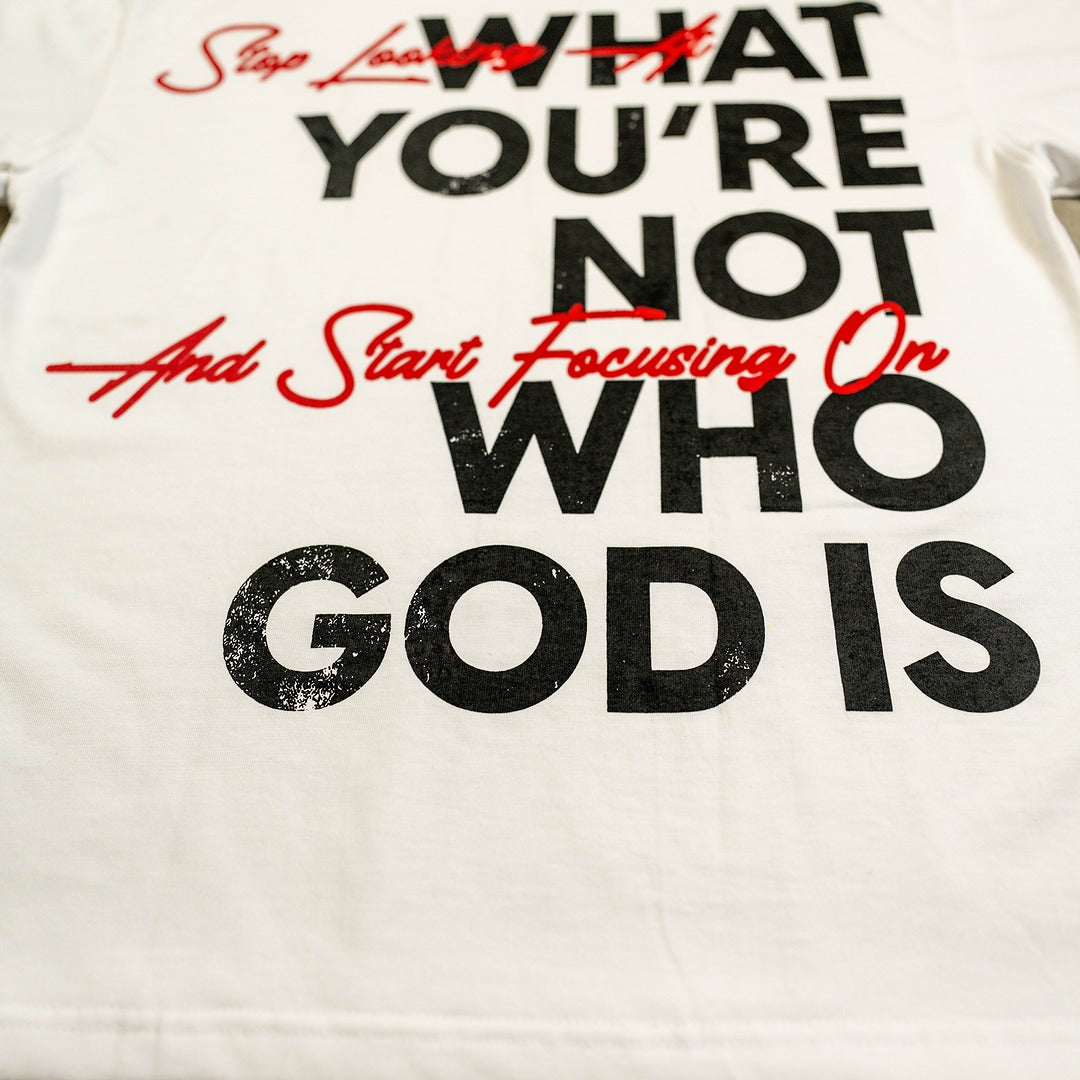 - Back Print: “Stop looking at what you’re not and start focusing on who God is.”